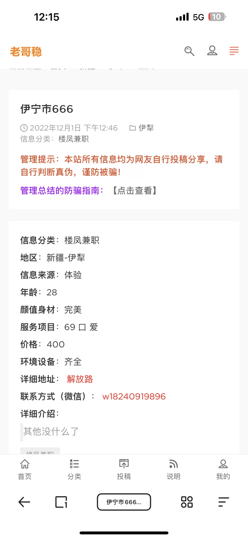 信息分类:骗子曝光 地区:新疆-伊犁 信息来源:老哥稳 年龄:28 颜值身材:完美 服务项目:69,口 价格:400 环境设备:齐全 详细地址: (管理提示:经用户举报,此信息有诈骗行为,请勿被骗!) 联系方式(微信): (管理提示:经用户举报,此信息有诈骗行为,请勿被骗!) 详细介绍: 假的,微信是个男的,骗过去先交安全费,妈的骗我10金币,牲口一样 骗子曝光