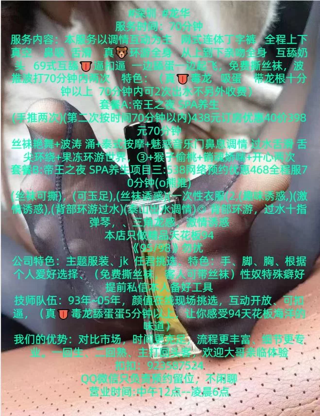 服务内容:本服务以调情互动为主网式连体丁字裤全程上下真空 鼻吸 舌滑真环游全身从上到下亲吻全身 互舔奶头 69式互舔丁逼扣逼 一边舔蛋一边起飞,免费撕丝袜,波推波打70分钟内两次特色:(真丁毒龙 吸蛋带龙根十分